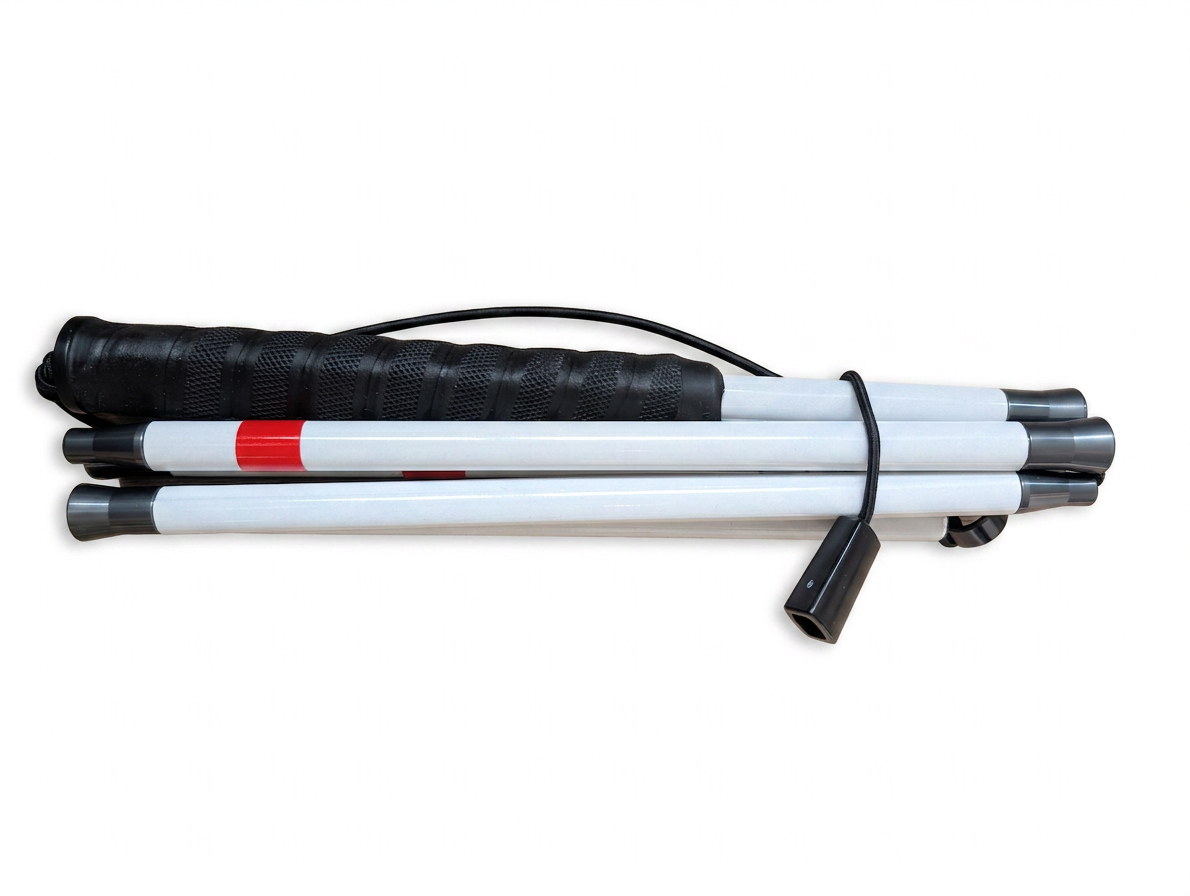 Deze Ambutech taststok van carbonfiber weegt gemiddeld 300 gram. Het exacte gewicht varieert per maat: bij een lengte onder de 130 cm is de stok lichter, terwijl varianten boven de 130 cm iets zwaarder zijn. De vijf delen zijn verbonden via een dubbel elastiek en aluminium pennen. Deze pennen sluiten nauwkeurig aan, waardoor de stok aanvoelt als één solide geheel.